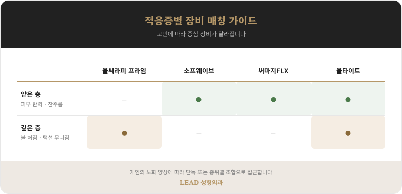 예를 들어, 깊은 층은 울쎄라피 프라임이나 올타이트가, 얕은 층은 소프웨이브나 써마지FLX가 담당하는 방식입니다. 어떤 조합이 적합한지는 개인의 노화 양상에 따라 달라지며, 이것이 장비를 여러 종 보유하는 것의 실질적 의미입니다.