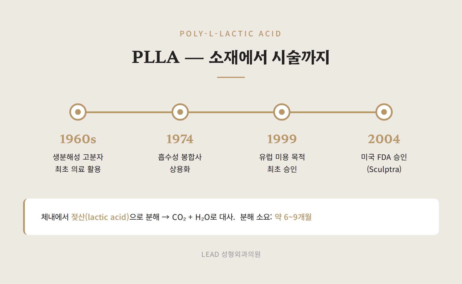PLLA(poly-L-lactic acid)는 체내에서 분해되는 합성 고분자입니다. 의료 분야에서는 1970년대부터 흡수성 봉합사로 쓰여왔고, 정형외과 고정 장치, 약물 전달 시스템에도 활용됩니다. 미용 목적으로는 1999년 유럽에서 처음 승인되었고, 2004년 미국 FDA 승인을 받았습니다.