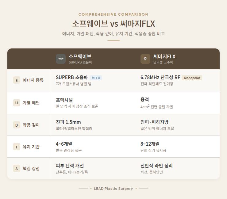 정리하면 이렇습니다. 소프웨이브는 초음파 에너지가 진피의 특정 깊이에서 열 영역을 만들고, 써마지FLX는 고주파 전기장이 넓은 범위의 조직을 한꺼번에 데웁니다. 같은 "열"이지만, 열이 만들어지는 원리가 다릅니다.