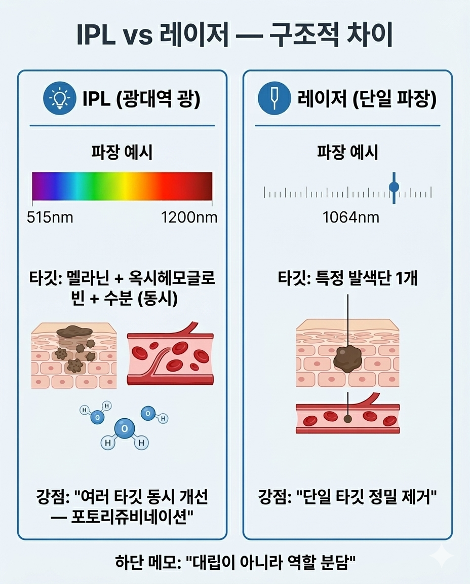 "IPL은 레이저보다 약한 것 아닌가?"라는 질문을 자주 받습니다. 결론부터 말하면, 약하고 강함의 문제가 아니라 설계 목적이 다릅니다.