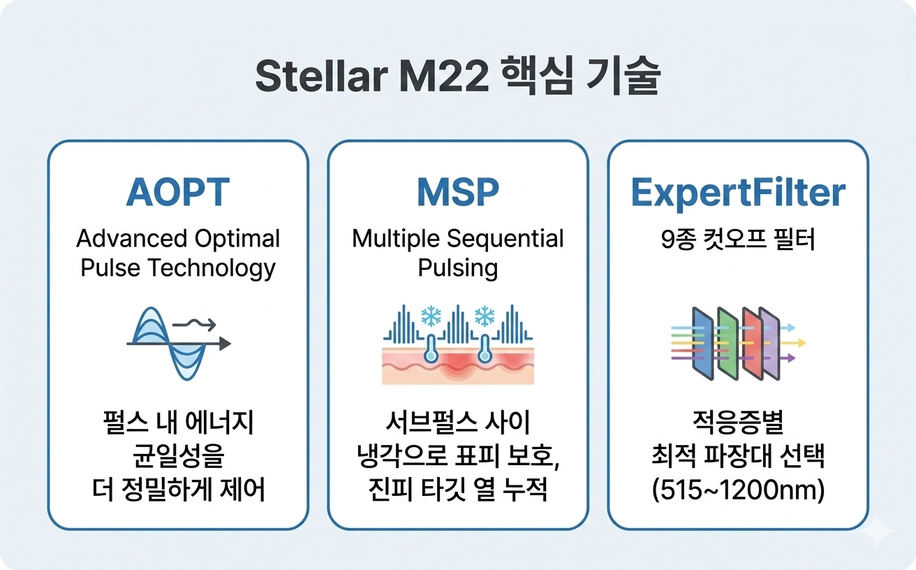 원리(광대역 광을 이용한 선택적 광열분해)는 동일합니다. 차이는 펄스 제어 기술입니다. OPT/AOPT가 적용된 Stellar M22는 에너지 균일성, 안전 장치(MSP), 필터 정밀도에서 기존 IPL과 차이가 있으며, 이는 부작용 리스크와 효과 예측 가능성에 직접적으로 영향을 미칩니다.