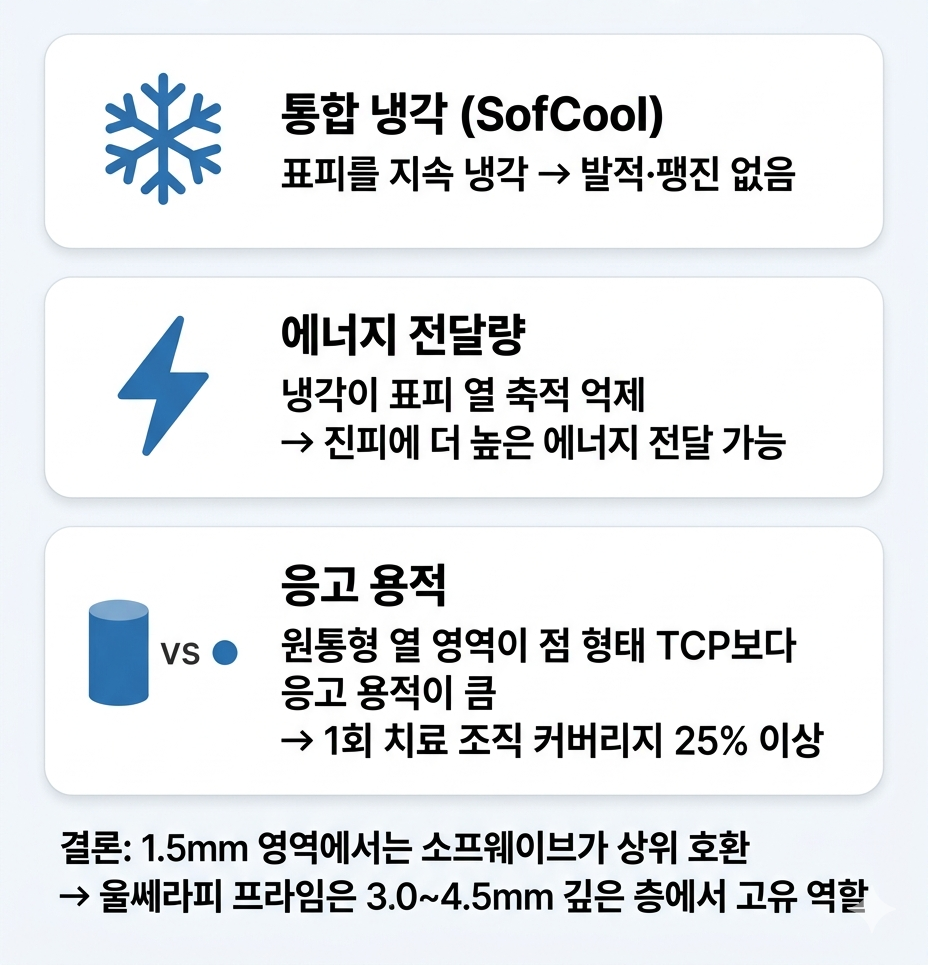 첫째, 통합 냉각입니다. SofCool이 표피를 지속적으로 보호하므로, MFU-V의 1.5mm 카트리지에서 간혹 보고되는 발적이나 팽진 같은 표피 반응이 발생하지 않습니다.
