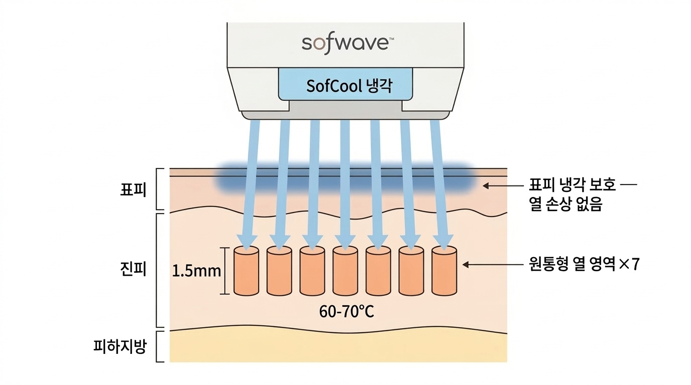 가열 패턴 — 프랙셔널 vs 벌크. 소프웨이브는 진피 1.5mm에 7개의 원통형 열 영역을 띄엄띄엄 만드는 프랙셔널 가열입니다. 열이 생기는 지점과 생기지 않는 지점이 교차하므로, 열 영역 사이의 정상 조직이 회복의 거점이 됩니다. 써마지FLX는 진피에서 피하지방 경계까지 넓은 면적을 균일하게 가열하는 벌크 가열입니다. 치료 영역 전체가 균등하게 온도가 오릅니다.